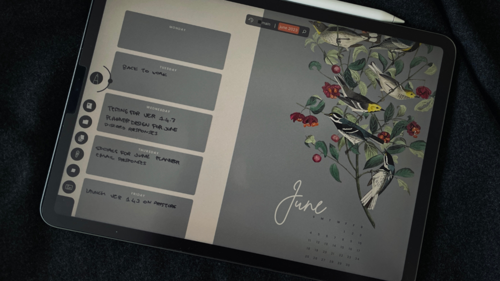 3 page pdf file to be used with Defter Notes app on iPad. A basic calendar page for June 2023, a lined paper and a weekly page in vintage style.